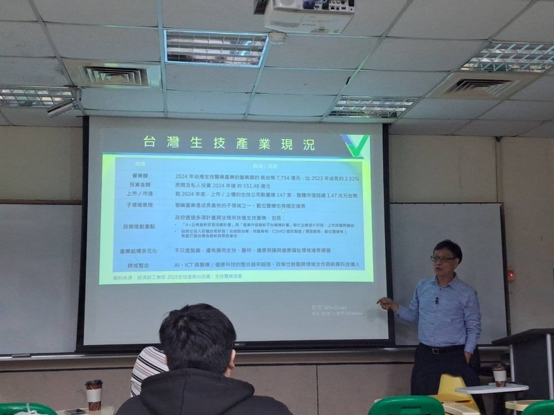 洪董事長首先說明臨床研究機構在生技與醫藥產業中的角色與功能,並結合自身學經歷,分享從生命科學背景進入產業的職涯歷程。之後進一步分析臺灣生技產業的整體發展現況,說明產業鏈中不同單位的分工模式,以及目前產業所面臨的競爭環境與挑戰,使學生對生技產業運作有更全面的認識。