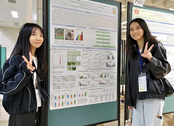 Screening of Low-Light–Adapted Microalgae from Yangmingshan and Evaluation of Their Application in Crop Cultivation Chia-Hsin Liu, Chiu-Yen Lin, I-Chieh Tseng 從陽明山陰影環境中分離出具低光適應力的本土微藻,發現其在低光環境下,能透過增加光合色素含量的方式維持高效生長。篩選出的微藻具有生物刺激素,應用於農作物灌溉時可提升其光合作用速率、生物量及根部長度。此成果可以做為開發友善環境肥料的基礎,且可以降低工業化生產所需的能源成本,提供具潛力的永續農業解決方案 |