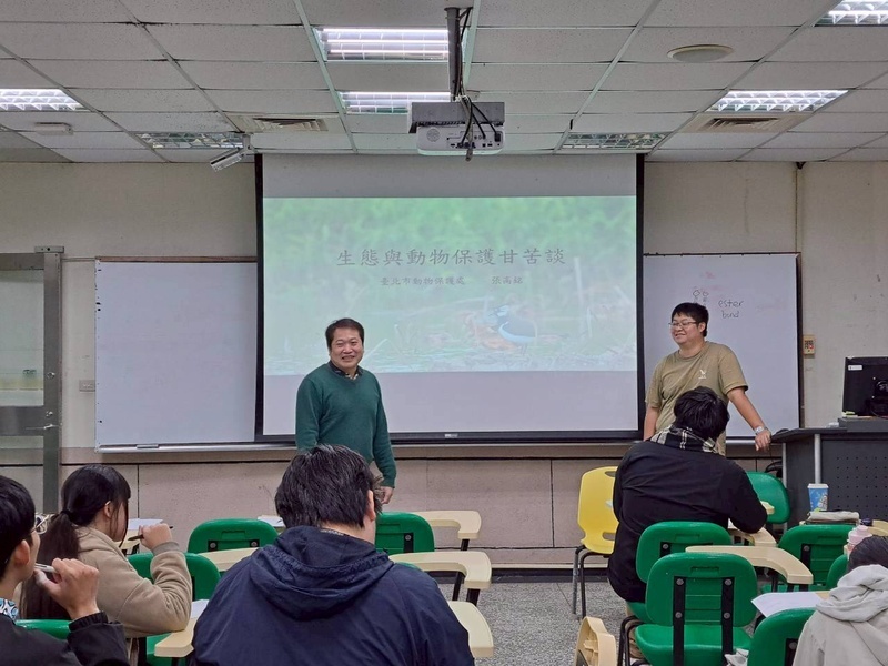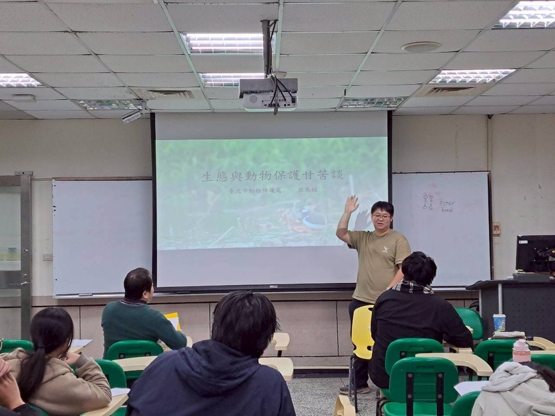 本次活動邀請到任職於台北市政府動保處的張高銘學長回校分享。演講一開始,學長先調查在場同學對於未來發展的意向,並以引入自己從生命科學系畢業後的轉折與嘗試。畢業後學長曾轉換了不少與生命科學領域相關的工作,包括獸醫助理、生態教育講師、研究助理,最後進入公部門執行動物保護業務。他特別針對該機構的組織架構運作進行了詳細解析。除了說明各組室單位負責的具體業務外,也大方分享了在動保處工作的日常與趣事,讓學生能具體想像公部門在生態保育與動物福利推動上的真實情境。