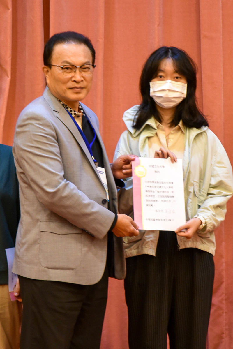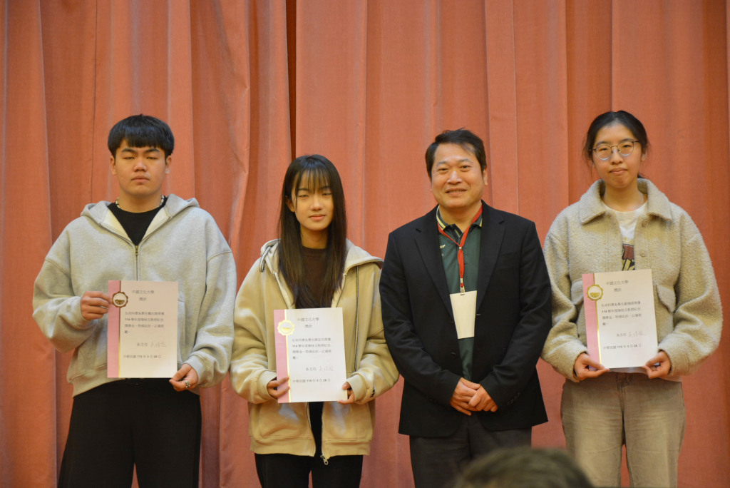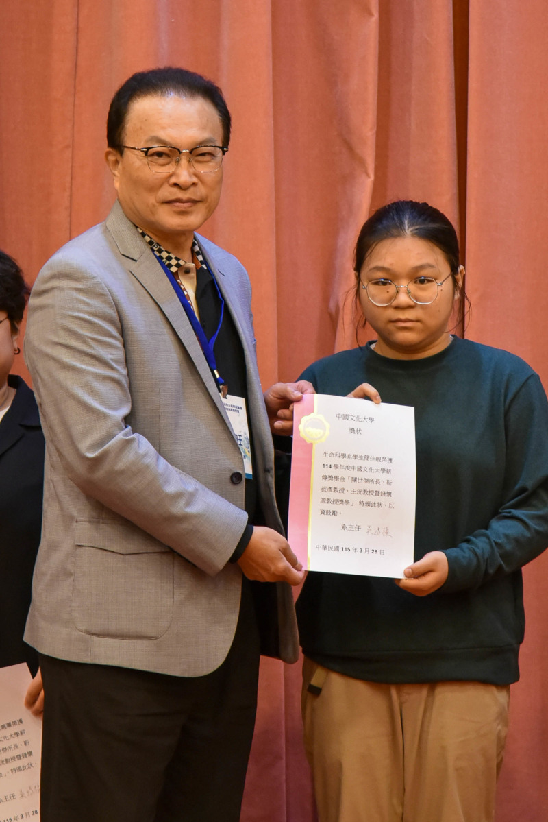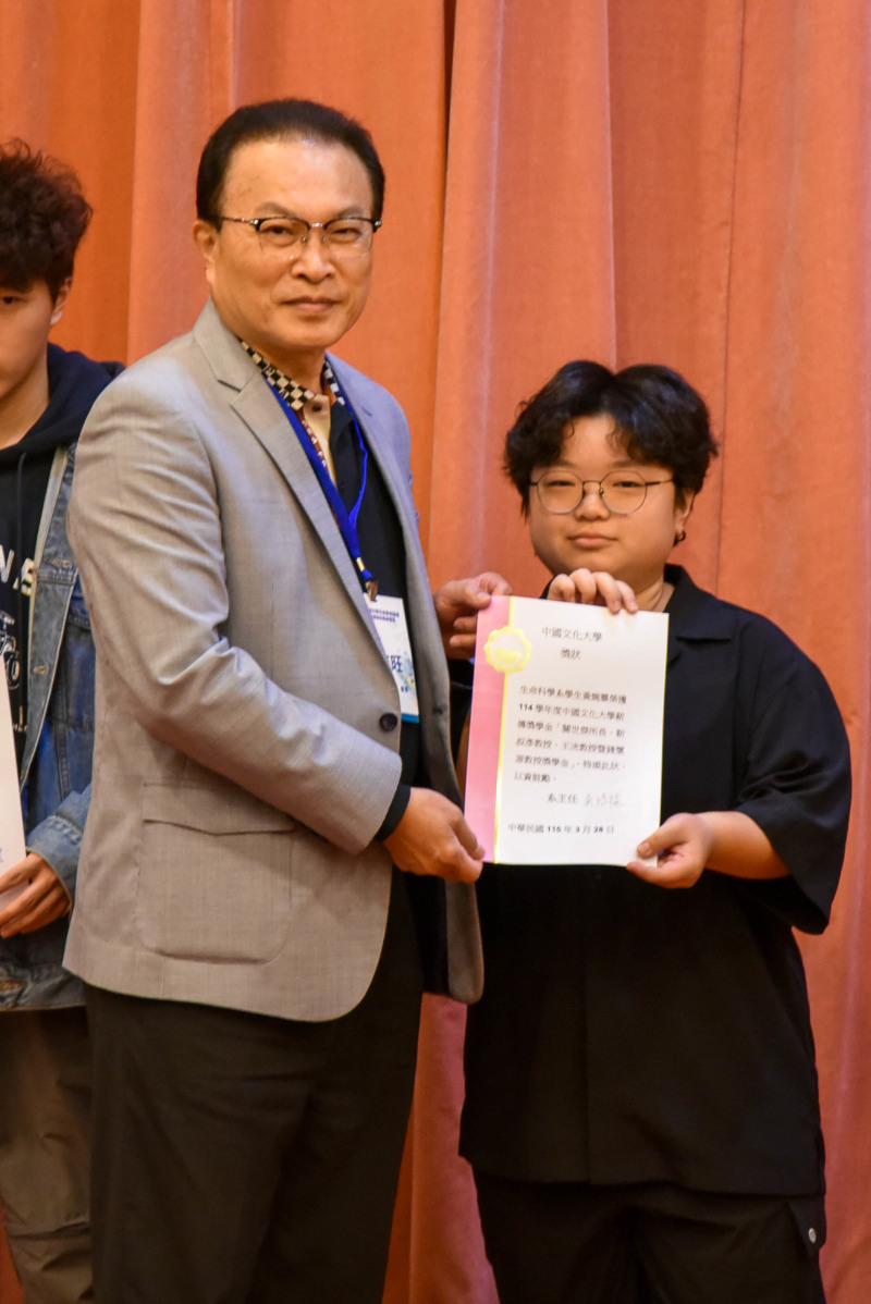 中國文化大學海洋研究發展中心致力於培育具備「學術深度」與「實務廣度」的跨領域人才,特別於2026年3月28日「2026 年地球科學系統學術論壇」會前,頒發獎勵以表彰積極修讀海洋相關課程,並在專業領域取得實務認證的傑出同學。本次生命科學系的獲獎學生有朱康瑜、陳苡瑄、陳佳珮、陳昱安及黃昱承共五位同學。獲獎學生均完成於國立海洋科技博物館開授的專業導覽培訓課程,成為未來海洋科普教育的新戰力。 獎項由長期支持海洋教育的萬壽興業股份有限公司關家惟董事長親自頒發。關董事長於典禮中勉勵獲獎同學,期許學生能將校園所學的知識,轉化為守護海洋環境與研究的能量。